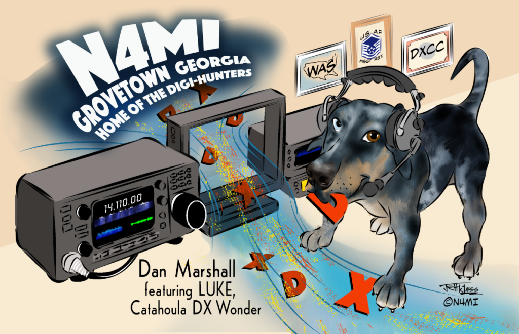 K1NSS Jeff at DASHTOONS designed the art for my QSL cards, and they were printed by Randy at KB3IFH QSL CARDS. If you’d like to create a unique and personal QSL card, you can’t beat the combination of Jeff K1NSS to create the art and Randy KB3IFH to print them! The DX Hound pictured on my QSL cards is my faithful Louisiana Catahoula Leopard Dog companion. His name is Luke.